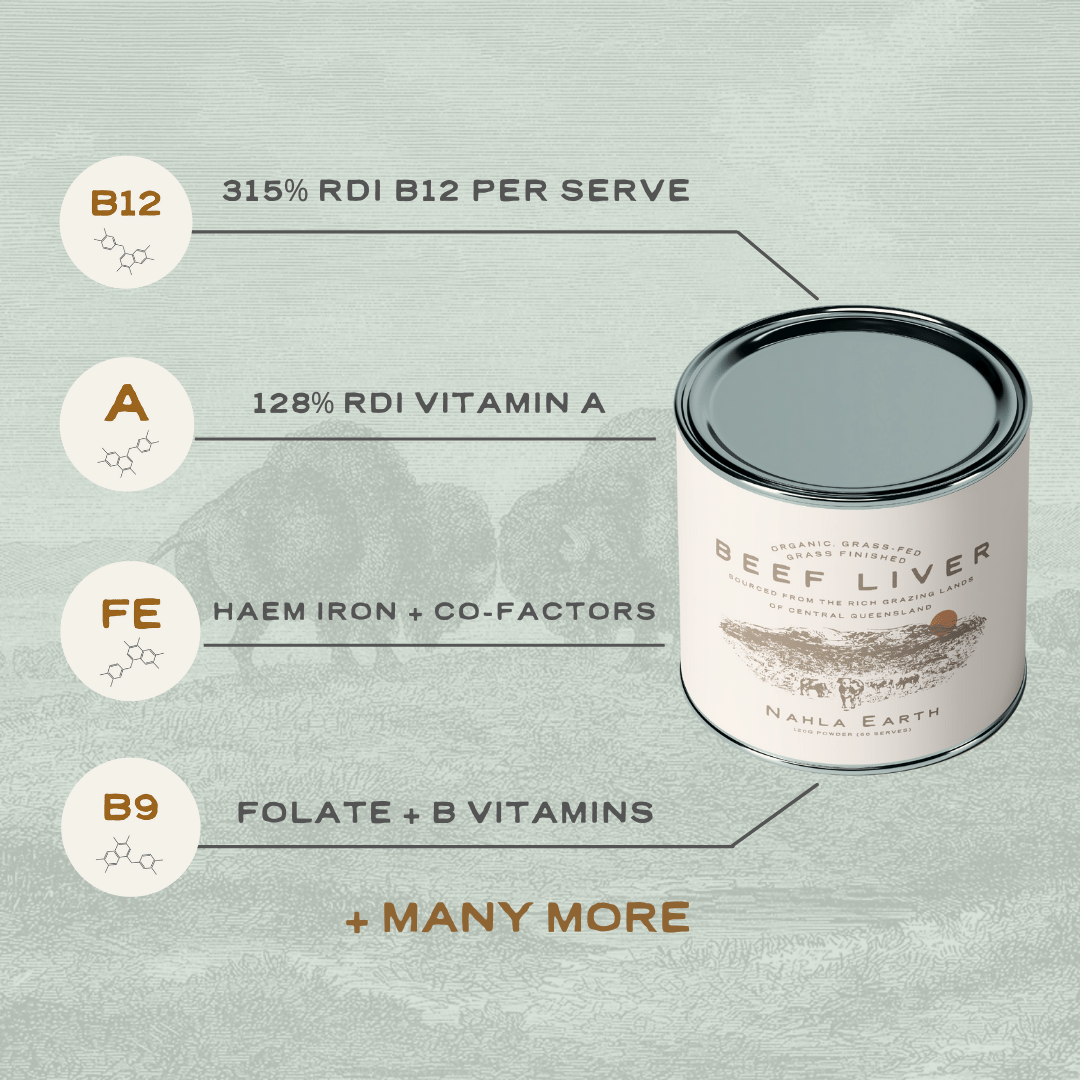 Beef Liver Powder contains active haem iron along with iron metabolising co-factors like B12, Vitamin A, Folate & Copper.